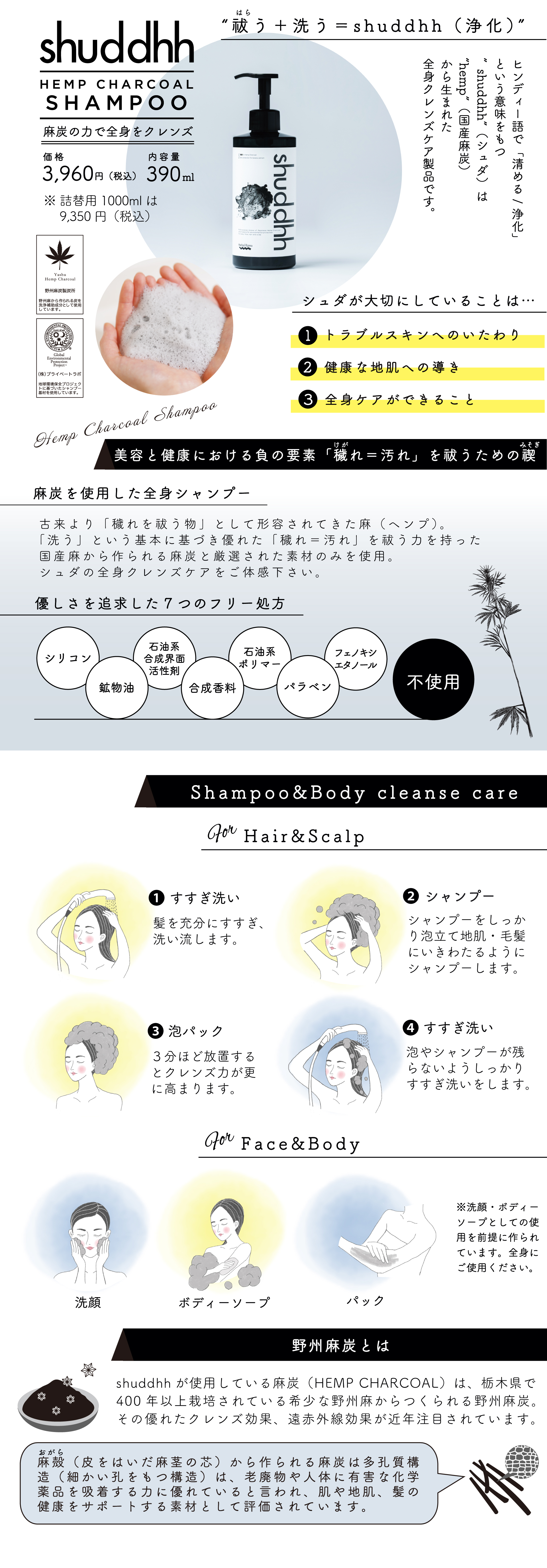 麻の力で全身をクレンズする shuddhh(シュダ)。ビューティープロフェッショナルのスキンコンディションを守る hemp charcoal という選択。プロの世界で認められた優れたクレンズ力と優しさ、テクスチャーは、ホームケアにおけるヘアー&全身クレンズという概念を生み出しました。